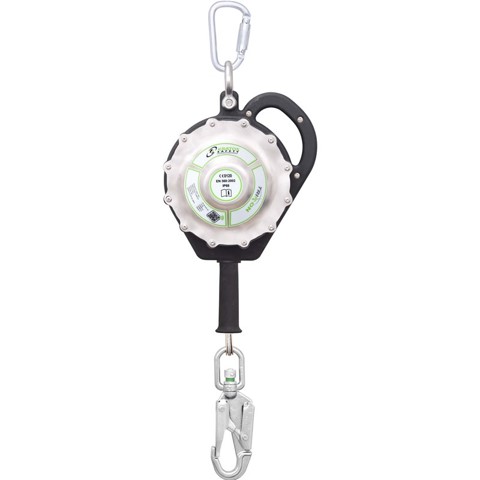 Fall arrest Kratos Triton - retractable - ATEX 1 - 10mtr- Casing made up of high impact strength Polymer with Stainless steel cover, integrated carrying handle.- Suitable for salty, aggressive and corrosive environments.- The design of the internal mechanism in 2 different parts allows a perfect impermeability (meets IP68 level of IEC 60529) of the blocking-braking system. As for the pulley & wire rope part, it allows to replace the wire rope quickly & easily with minimum tools.- Comes with Stainless Steel Wire Rope of diam 4.5 mm having:=> a stainless steel connector with load indicator=> a gripping handle.- Internal braking mechanism to reduce the fall arrest force to less than 6 kN.- 180°-pivoting anchorage loop & FA 50 106 22 stainless steel connector at anchorage end.- Weight: 7.36 kg.- Weight: 7.36 kg.- Delivered with a cord (FA 20 904 10) for guiding the winding back of the wire rope.Compliance: EN 360:2002, IEC 60529 (IP68), ATEX Zone 1.Minimum breaking strength > 12 kN.Approved for a user with a max. weight of 140 kg in vertical use only.